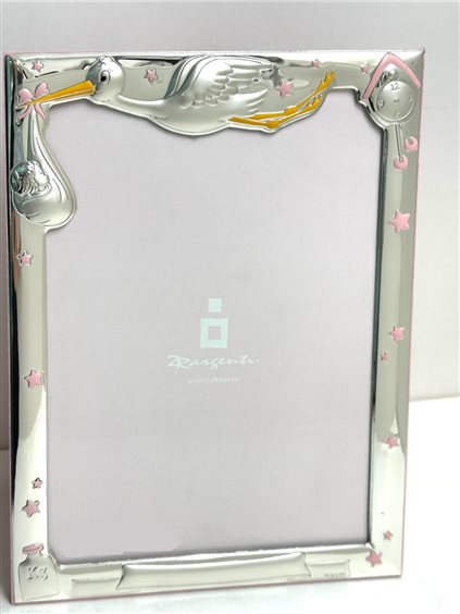 Cornice in argento e legno rosa, con smalto e possibilità di incidere data, ora e nome della bambina.