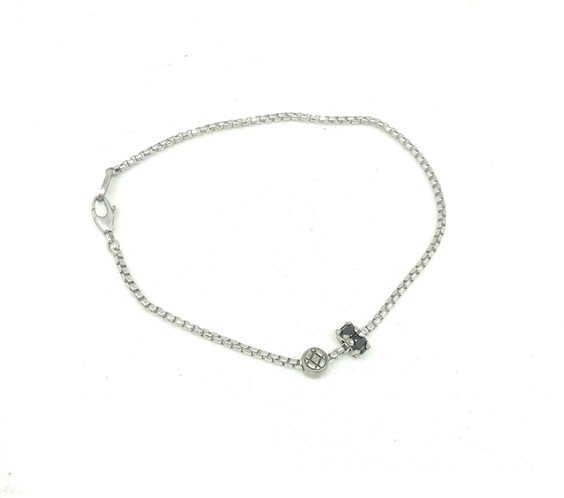 Bracciale in argento con maglia veneziana e inserto rotondo con decoro a rete e inserto passante con zirconi neri.