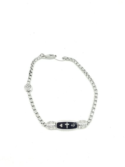 Bracciale in maglia veneziana rotonda con targhetta centrale di 1 cm in argento e smalto nero con inciso cuore, croce e ancora e dietro Hope Charity Faith.