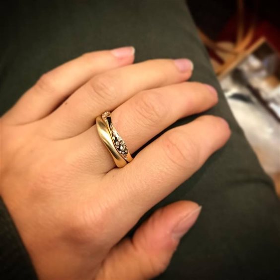 Anello formato da una coppia di anelli uno lucido l'altro satinato che uniti assieme combaciano come un puzzle. Impreziositi da zirconi colorati con sfumature dal bianco all'oro.
