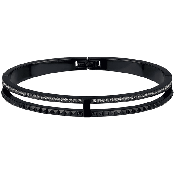 bracciale rigido in acciaio lucido IP nero con una fila di borchie e una fila di cristalli neri.