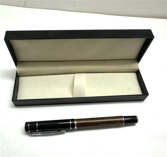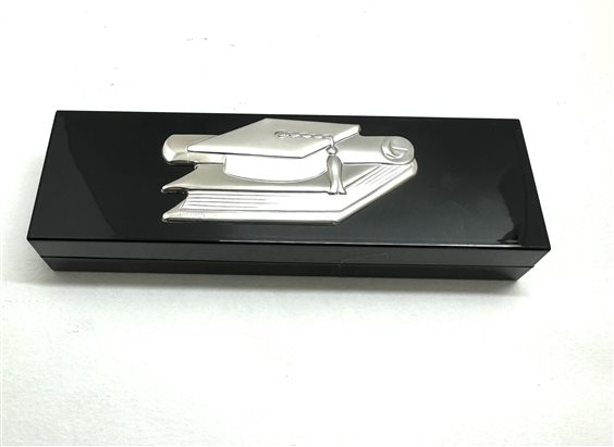 Scatola in policarbonato nero con applicato in argento un decoro per Laurea e penna roller nera e marrone tipo legno.