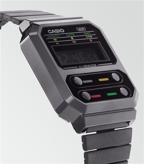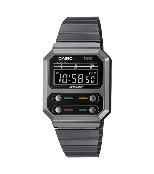 Soddisfa la tua voglia di gadget con questo orologio elegante unisex direttamente dalla collezione Casio Vintage. La linea A100 rende omaggio all'F‐100, il primo orologio Casio costruito con cassa in resina. Abbiamo mantenuto l'iconico layout con quattro pulsanti frontali, ma abbiamo introdotto componenti metallici, ancora in stile vintage, per la rivisitazione di un vero classico. In stile retrò ma con funzionalità moderne, questi orologi vantano un cronometro, un calendario e un'impermeabilità per l'uso quotidiano e, naturalmente, una luce LED per una facile lettura con qualsiasi tipo di illuminazione. Utilizza la chiusura scorrevole per regolare facilmente la lunghezza del cinturino per una perfetta vestibilità.