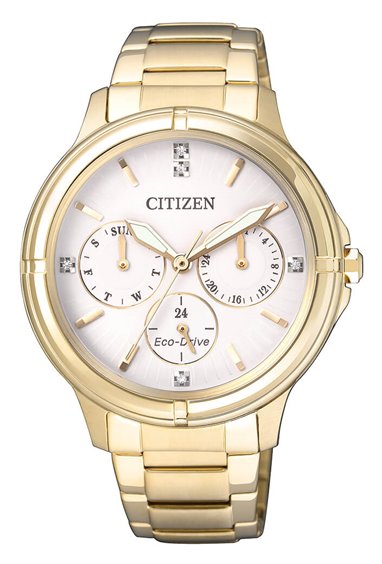 Orologio Citizen modello Elegant con movimento Eco Drive. Cassa e cinturino laminato in oro giallo. Quadrante bianco multifunzioni e vetro minerale.