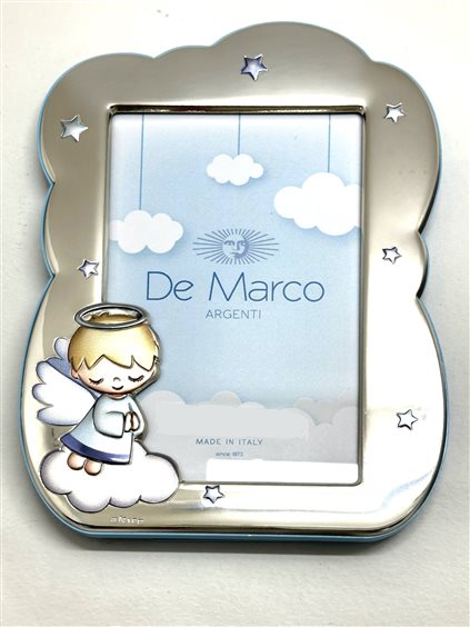 Cornice in argento e legno azzurro a forma di nuvola con angioletto. Foto 9x14cm
