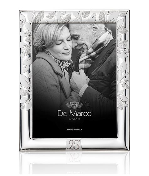 Cornice in argento laminato con decorazione di foglie lucide e satinate e ricamato il numero 25°. Disponibili in due misure: - 13 x 18 cm - 18 x 24 cm