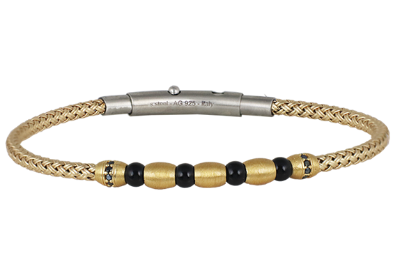 Bracciale in argento dorato satinato con decoro centrale con palline di onice e spinelli neri .