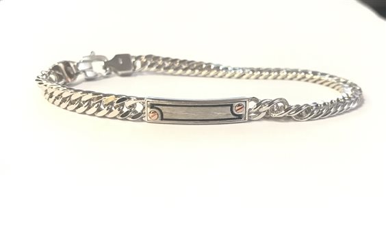 Bracciale in argento 925 con targhetta satinata con contorno in smalto nero e viti in argento rosato.