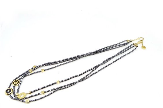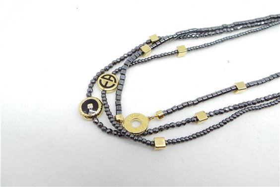 Collana Emporio Armani formata da tre fili in ematite e inserti in argento dorato, smalto nero e zirconi, chiusura in argento dorato con moschettone e catenella per allungare la collana da cm 40 a 45.