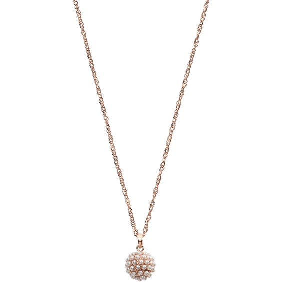 Collana ritorta in acciaio rosato con 2 anellini finali e ciondolo centrale pendente formato da una palla tempestata di perline bianche.