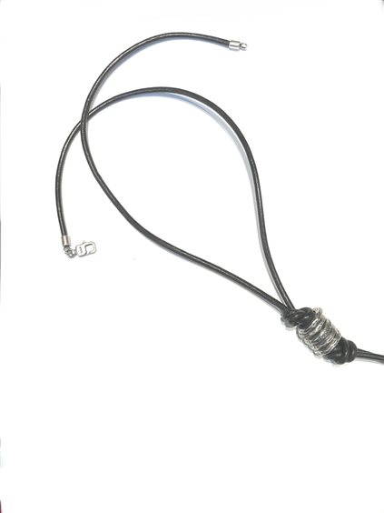 Collana in cuoio nero con ciondolo ad anelli in argento anticato.