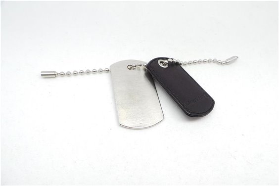 Portachiavi in argento satinato e pelle di Emporio Aarmani. Possibile incisione su targa in argento cm 5 x 2,5. Chiusura a vite.