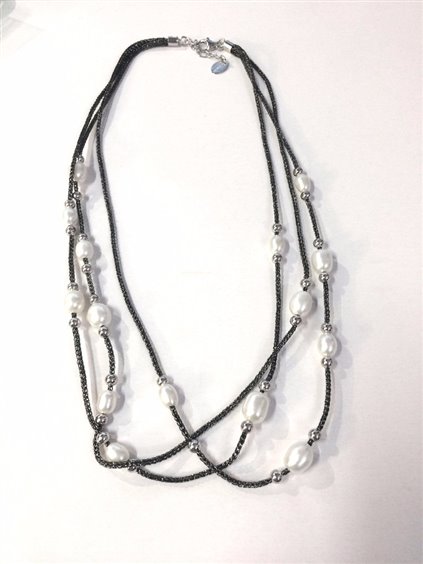 Collana in lurex brunito e perle coltivate bianche, con inserti in argento.