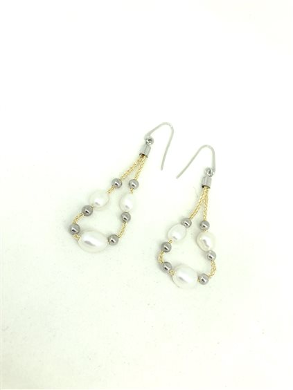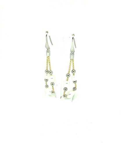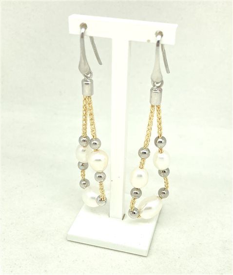 Orecchini pendenti ad amo in argento con filo in lurex dorato, perle bianche ovali e palline in argento da 4 mm