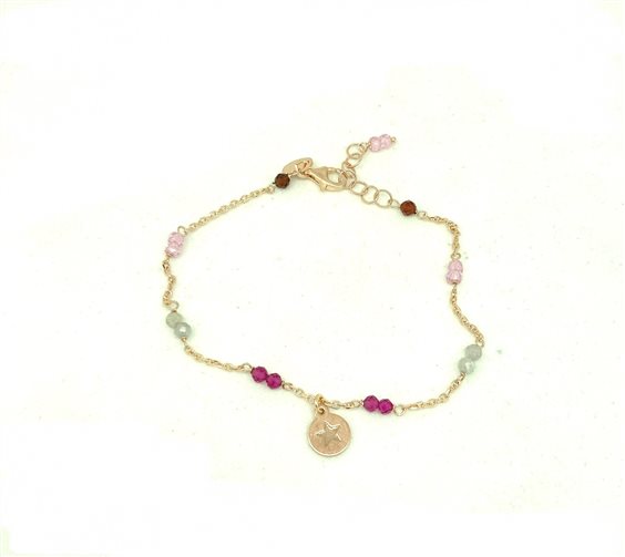 Bracciale rolò in argento rodiato oro rosa, con pietre sfaccettate, in quarzo color rosa, rosso e labradorite grigia. Charms centrale con stella.