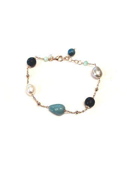 Bracciale in argento rosato con perle barocche una grigia e una bianca, due pietre sfaccettate Quarzo blu london, e Calcedonio azzurro.