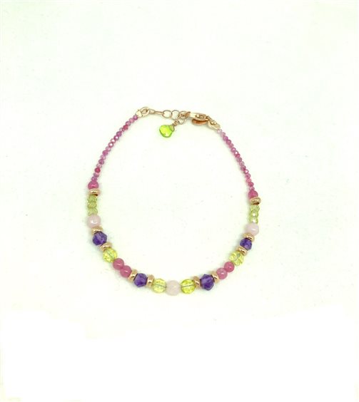 Bracciale con pietre di tormalina rosa sfaccettate, alternate a pietre di quarzo rosa, peridoto, ametista e argento rosato.