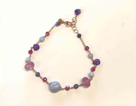 Bracciale in argento rodiato oro rosa con pietre di Ametista, Calcedonio, Quarzo fucsia, Quarzo rosa.