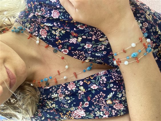 Bracciale a tre fili in argento rosato con pietre di turchese, corallo rosso e perle.
