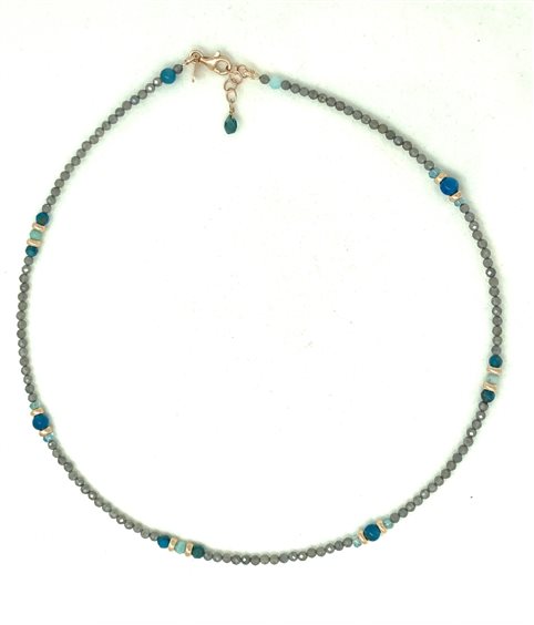 Collana con pietre di labradorite grigia sfaccettate, alternate a pietre rotonde di agata azzurra, acquamarina.