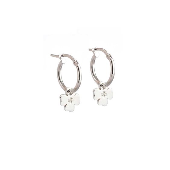 Orecchini a cerchio da 1 cm in argento con quadrifogli rodiati con zircone centrale.
