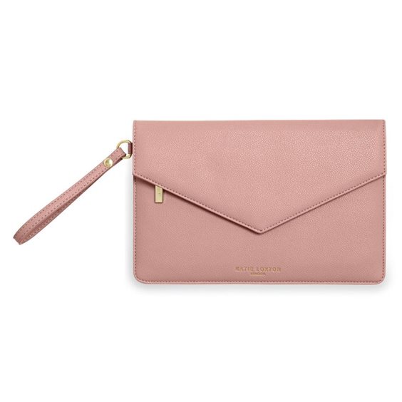 Pochette a busta, dotata di un cinturino da polso staccabile in modo da poter creare look diversi, con clip e zip interna , realizzato in 100% pelle vegana rosa pallido. Interno completamente foderato con cuciture rifinite. Scritta in oro carattere chic Always live laught love