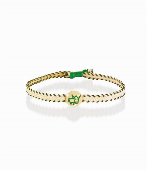 Bracciale in oro giallo con inciso il simbolo del toro e cordino in cotone e color crema e verde.