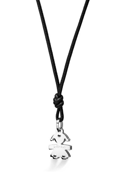Ciondolo con sagoma femminuccia in oro bianco , altezza 1 cm. larghezza 0,90 cm., cordino color nero. Tutti i gioielli della linea le Bebé possono essere personalizzati.
