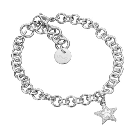 Bracciale da donna di Liu Jo della collezione Essential realizzato in acciaio color silver con pendente simbolo stella impreziosito da dei cristalli bianchi, lunghezza regolabile da 17 cm a 19 cm, chiusura con moschettone.