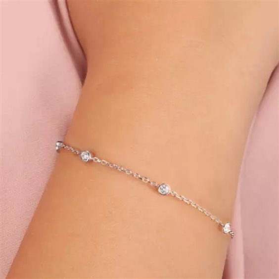 Bracciale in oro bianco 375/.. e diamanti ecologici creati dalla Morellato Live Diamond, nel modello realizzato a cipolline con diamanti coltivati in laboratorio nel rispetto dell'ambiante e con risparmio di acqua ed energia pur rispettando le caratteristiche di lucentezza, purezza e caratura del diamante tradizionale. Il bracciale ha una lunghezza di 17 cm allungabile con 2 anellini a 18 e 19 cm