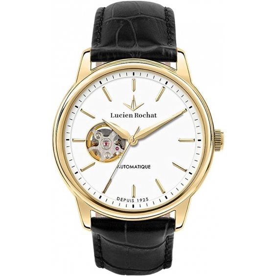 Orologio Lucien Rochat uomo. Movimento automatico. Orologio in acciaio color oro con cassa di 42 mm. Quadrante bianco con trasparenza , Cinturino in pelle nero. Vetro con trattamento zaffiro. Chiusura con fibbia ardiglione. Impermeabilità fino a 3 ATM.