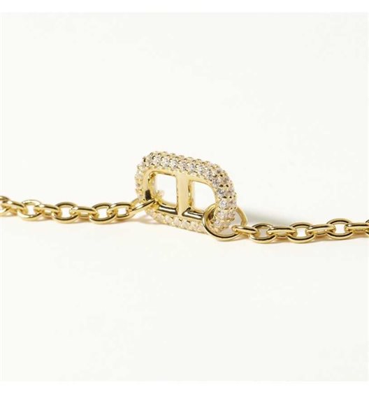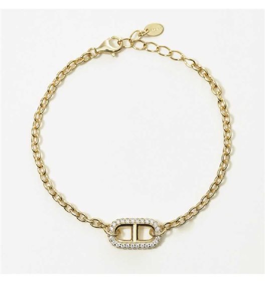 Braccialetto da donna realizzato in argento 925% dorato con catena rolò dallo spessore di 2,9 mm. Elemento centrale dalle dimensioni di 16,1 mm x 9,1 mm impreziosito da zirconi bianchi. Lunghezza di 19 cm. Chiusura con moschettone.