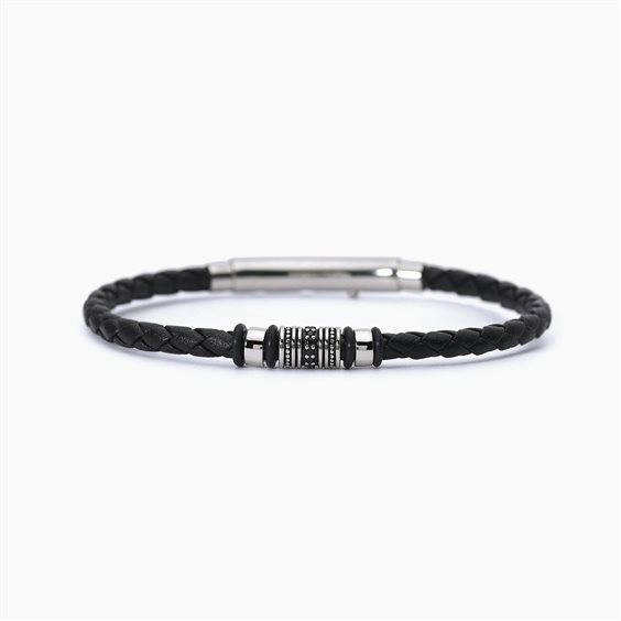 Bracciale argento 925/°°° finitura rodiata con zirconi neri Ø 1.25 mm , acciaio 316L ipoallergenico e similpelle nera, lunghezza 22 cm