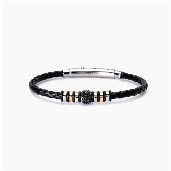 Bracciale regolabile da uomo in argento rodiato con lab leather nera intrecciata, elemento centrale con zirconi neri ed elementi in argento lucido e placcato oro rosa. • Dimensione elemento centrale: 6 x 8 mm • Diametro elementi secondari: 6 mm • Diametro degli zirconi neri: 1.5 mm • Misura regolabile, lunghezza da 20 a 22 cm • Materiale: Argento 925, Lab Leather, Zirconi, Acciaio 316L • Finitura: Placcatura elementi oro rosa 18K