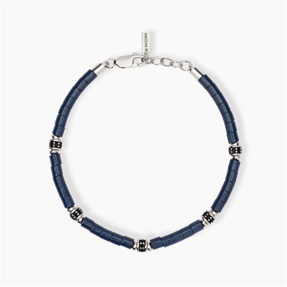 Bracciale regolabile da uomo in argento rodiato con cilindri in ceramica blu alternati ad elementi rotondi e zirconi neri. • Dimensione cilindri in ceramica: 4 x Ø 4 mm • Dimensione elementi: 3.5 x 5 • Diametro degli zirconi neri: 1.5 mm • Misura regolabile, lunghezza da 19 a 21 cm • Materiale: Argento 925, Zirconi, Ceramica