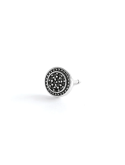 Monoorecchino a lobo. Colore: argento e nero. In argento 925‰ rodiato decorato con zirconi neri e borchie. Chiusura a perno.