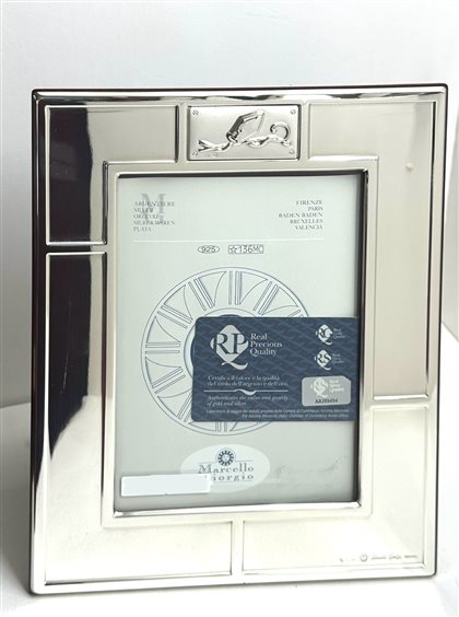 Cornice in argento con decoro della Cresima, spazio per foto 13x18cm, retro in legno