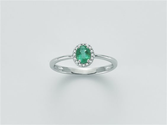 Anello in oro bianco 18 carati ideato e realizzato da Miluna. L'anello Miluna è impreziosito da uno smeraldo di carati 0,32 di millimetri 5 x 4 e sedici diamanti di carati totali 0,06 colore G purezza SI e taglio brillante rotondo, misura 14.