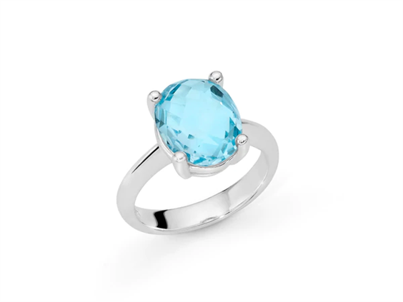 Anello solitario con topazio briolette azzurro e gambo in argento con 4 graffe.