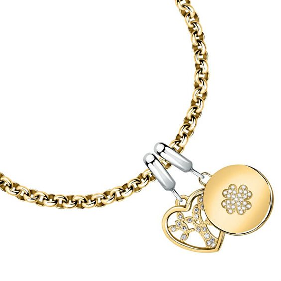 Bracciale in acciaio dorato con maglia rolò, due ciondoli pendenti con zirconi, possibilità di aggiungerne altri.