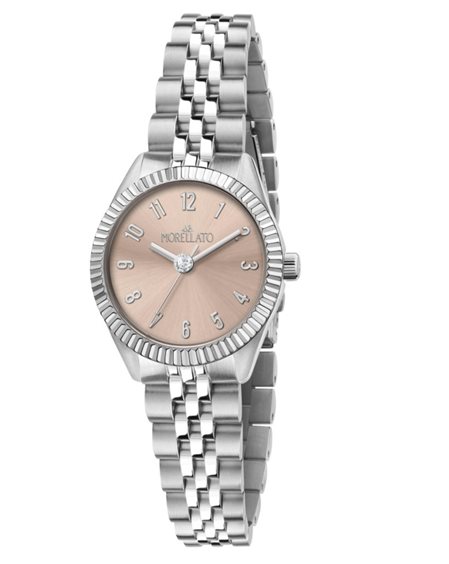 Orologio morellato da donna con movimento al quarzo VJ21 e funzioni di solo tempo. Cassa rotonda in metallo dal diametro di 28 mm. Lunetta zigrinata. Quadrante analogico rosa con indici a bastoni e cristallo bianco centrale. Cinturino in acciaio anallergico silver; chiusura deployante con pulsanti. Resistente all'acqua fino a 30 metri di profondità.