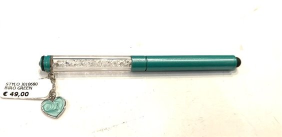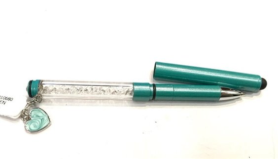 Penna in acciaio verde tiffany e swarovski. Cappuccio con gommino per touch screen e cuoricino appeso con smalto colorato. Cartuccia nera sostituibile.
