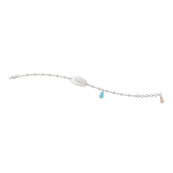 raffinato bracciale in puro argento della linea Nanàn Bijou è rifinito nei dettagli, con una targhetta in cui inserire il tuo nome o quello del tuo bimbo.incisione omaggio Due orsetti incastonati in un cerchio sono appesi al braccialetto. Dono prezioso, ricordo per la vita. incisione gratuita misura cm 15 regolabile fino a 13 cm . incisione gratuita