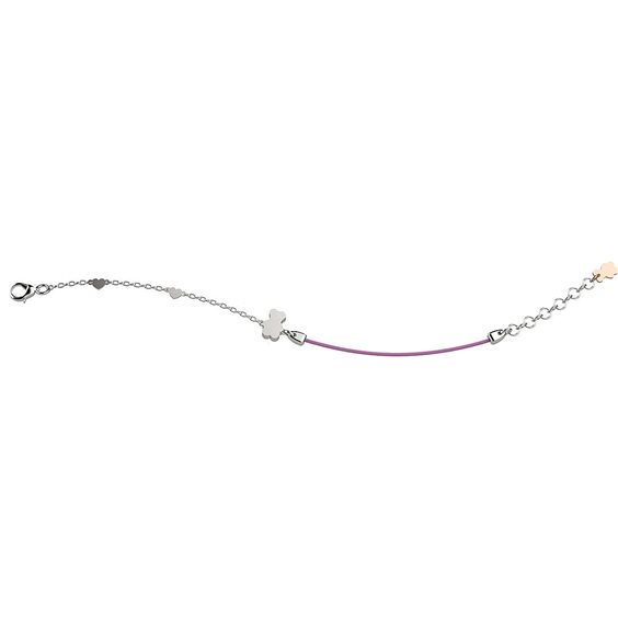 Bracciale con cordino nautico rosa, con orsetto centrale in argento con catenella con cuoricini e zirconi..
