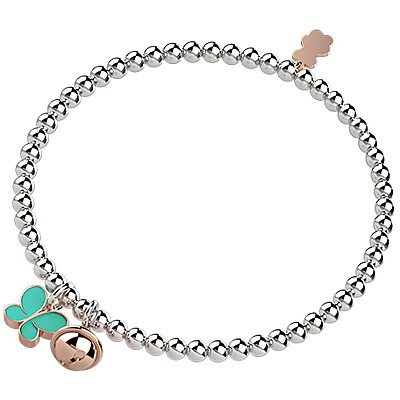 Bracciale elastico con campanella in argento rosato e farfalla verdeacqua.