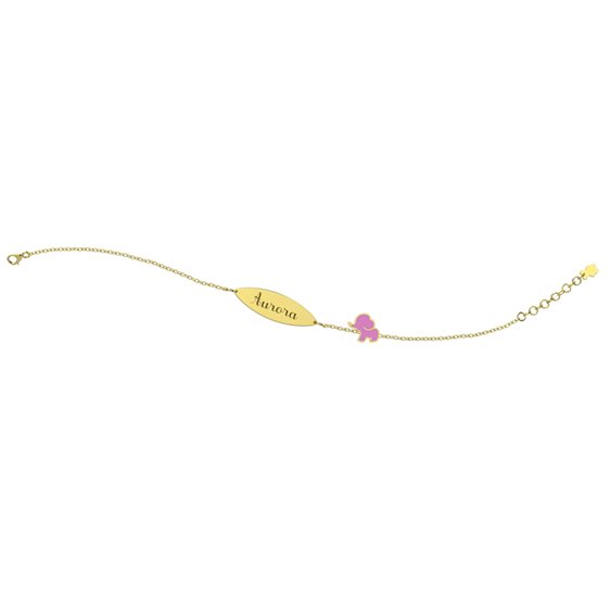 Bracciale in oro 9 kt da bimba con targhetta con possibilità di incisione ed elefantino in smalto rosa. misura regolabile 13-15 cm. In regalo il bellissimo orso Tato in peluches da 18 cm.