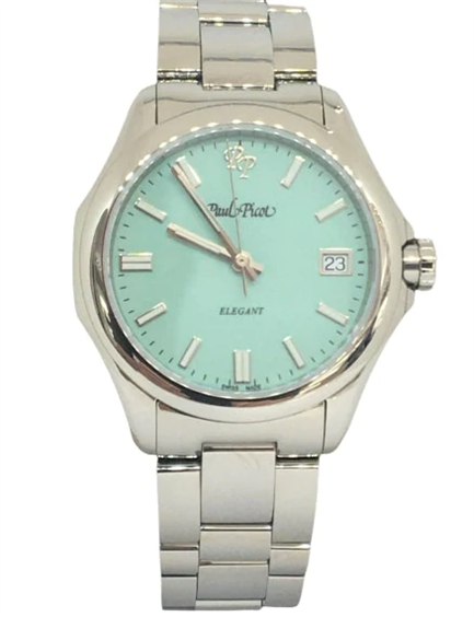 OROLOGIO PAUL PICOT ELEGANT 36M DONNA MOVIMENTO: SVIZZERO AL QUARZO, SOLO TEMPO CON DATARIO. CASSA: IN ACCIAIO MM 36 CON VETRO ZAFFIRO CON LUNETTA E CORONA A VITE. QUADRANTE: VERDE TIFFANY CON INDICI BIANCO/ACCIAIO. IMPERMEABILITÀ: 10 ATMOSFERE (100 MT.) BRACCIALE IN ACCIAIO REGOLABILE CON CHIUSURA DEPLOYANTE.