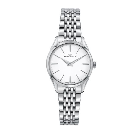 Collezione Roma Classic: movimento al quarzo Swiss Made, cassa in acciaio inox mm.32, bracciale in acciaio con fibbia déployante, quadrante argento chiaro, vetro zaffiro antigraffio, impermeabilità 5 atm.