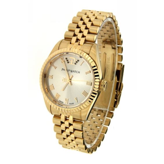 Orologio da donna in acciaio dorato monta un movimento RONDA 505. Vetro zaffiro con lente per datario ad ore 3. Cinturino magia Giubilee dorato con chiusura deployante.