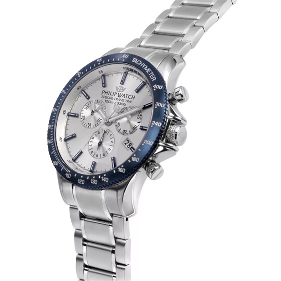 OROLOGIO PHILIP WATCH GRAND REEF Sportivo da Uomo, Materiale e finitura cassa: Acciaio, Vetro zaffiro,cinturino in Acciaio con Chiusura a Doppia farfalla con pulsanti, Movimento al Quarzo, Swiss made. Water resistant: 10 atm, Garanzia: Ufficiale 2 anni Philip Watch, Confezione: Originale Philip Watch